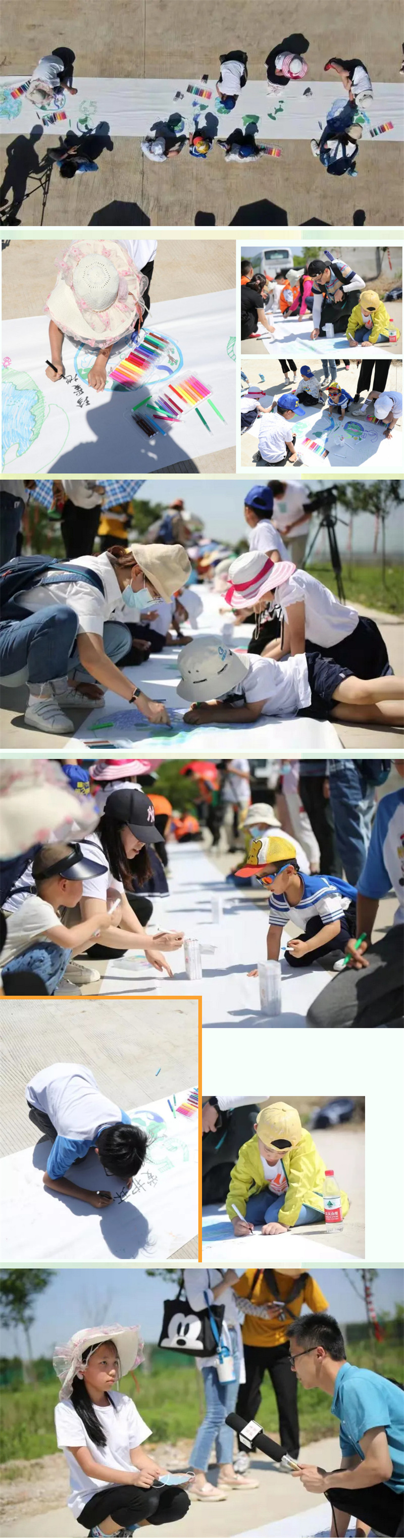 隨后,孩子們積極參與到保護地球百米畫卷繪畫活動中。從“歌手”搖身一變?yōu)椤爱嫾摇保祚R星空的想象力、腦洞大開的創(chuàng)造力……孩子們用手中的彩色畫筆在百米長卷上盡情揮灑,畫出了他們心中、眼中的地球“母親”,“保護環(huán)境”、“珍愛地球”……畫卷上寫下的句句話語,是孩子們在幼小的心靈里立下的錚錚誓言。