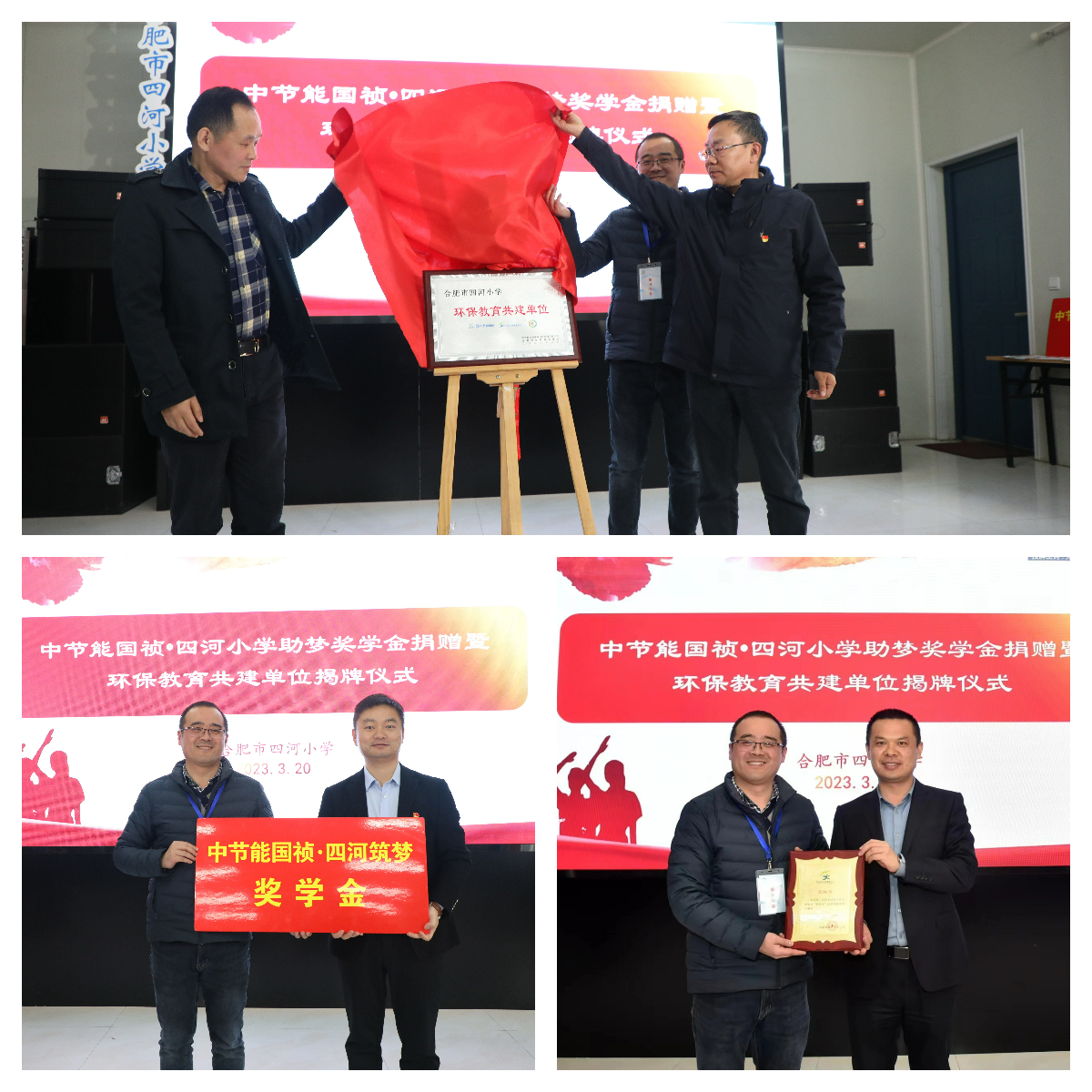 活動中,廬陽區農林水務局黨委委員、副局長李維福、中節能國禎合肥區域公司總經理王國勝、國禎慈善基金會秘書長楊桂英、四河小學校長胡旭東分別講話。企校雙方共同啟動“捐贈儀式”,并為環保教育共建單位揭牌。